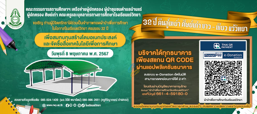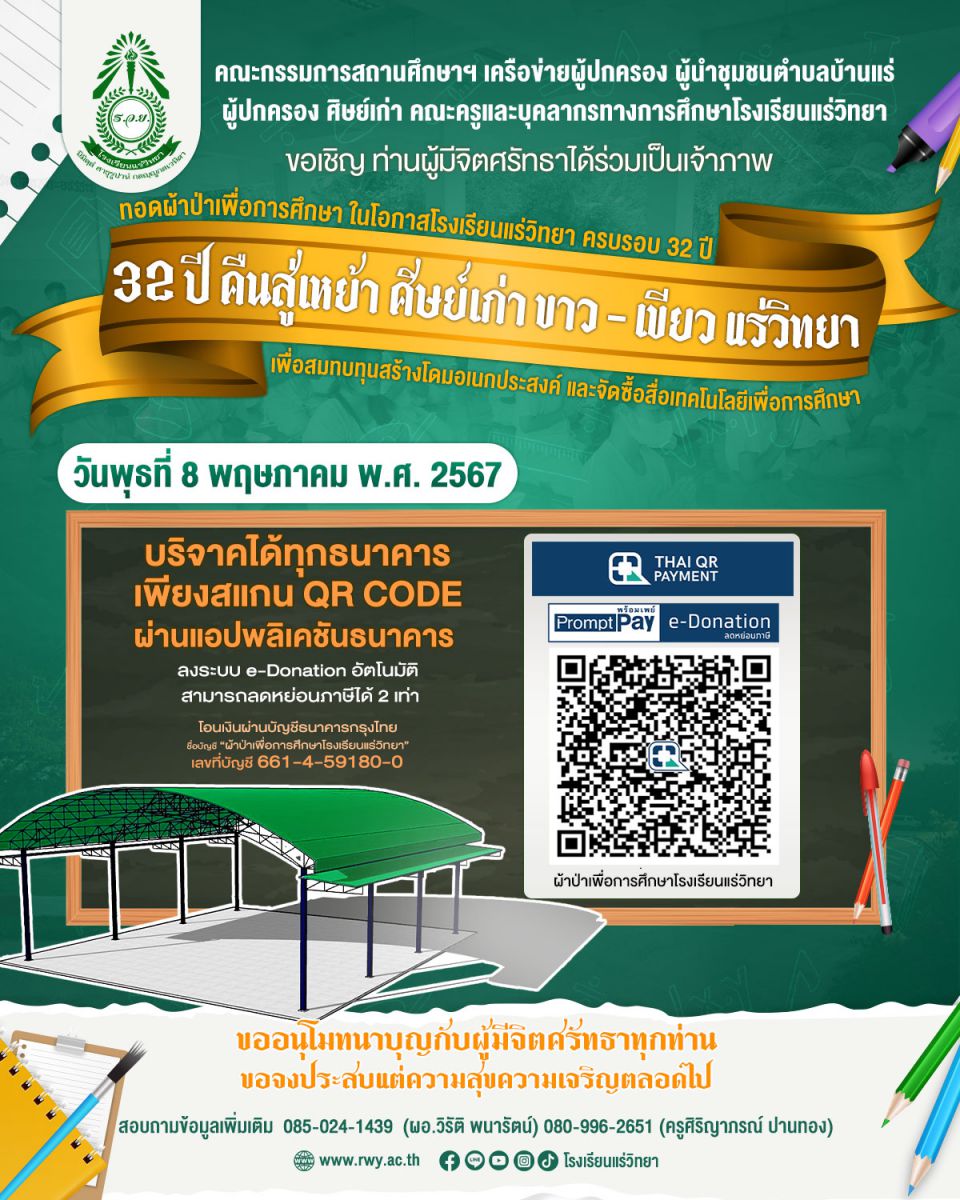 โรงเรียนแร่วิทยา เชิญชวนผู้มีจิตศรัทธา ร่วมเป็นเจ้าทอดผ้าป่าเพื่อการศึกษา ในโอกาสโรงเรียนแร่วิทยา ครบรอบ 32 ปี "32 ปี คืนสู่เหย้า ศิษย์เก่า ขาว - เขียว แร่วิทยา"
