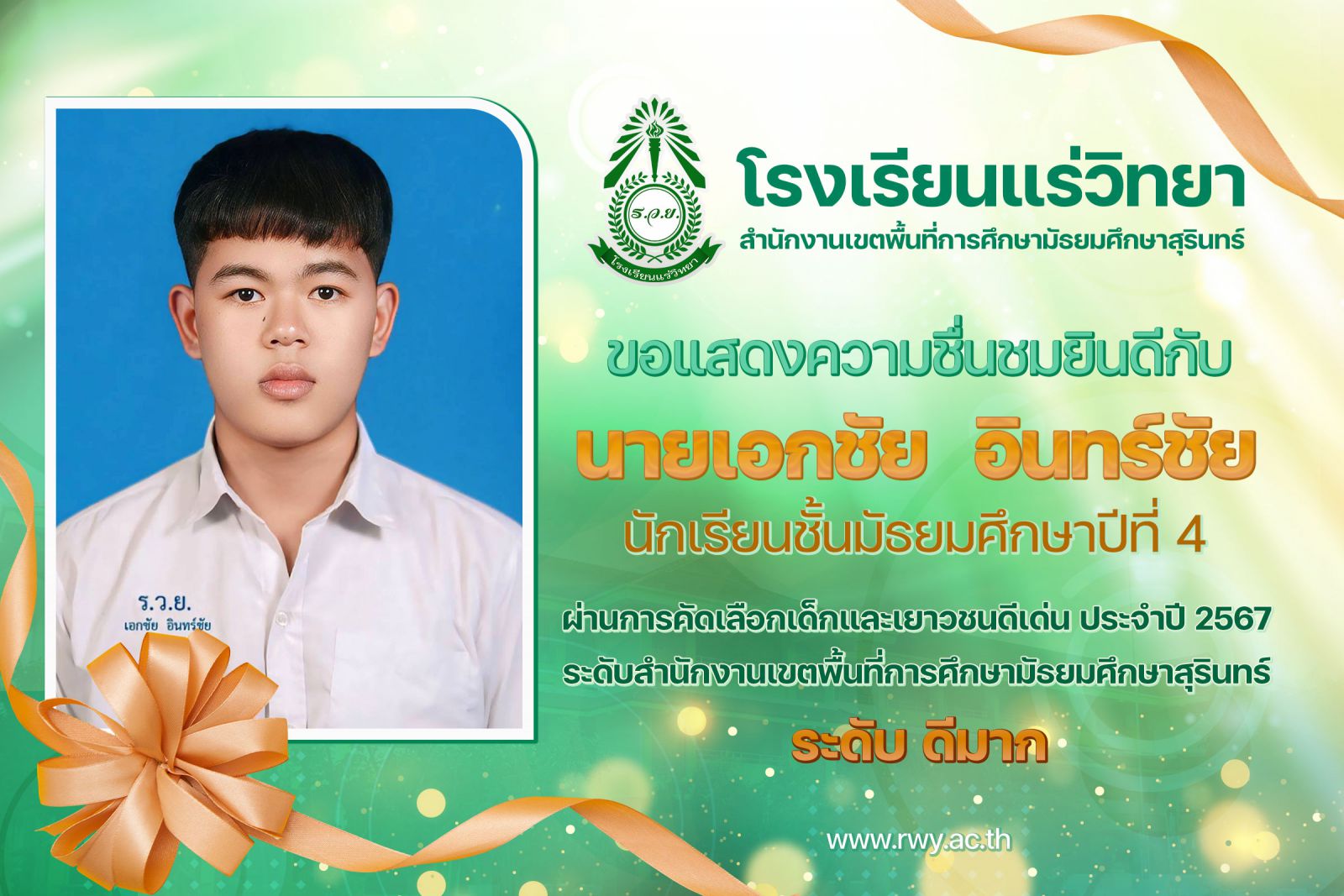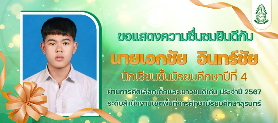 โรงเรียนแร่วิทยา ขอแสดงความชื่นชมยินดีกับ "นายเอกชัย อินทร์ชัย นักเรียนชั้นมัธยมศึกษาปีที่ 4" ผ่านการคัดเลือกเด็กและเยาวชนดีเด่น ประจำปี 2567