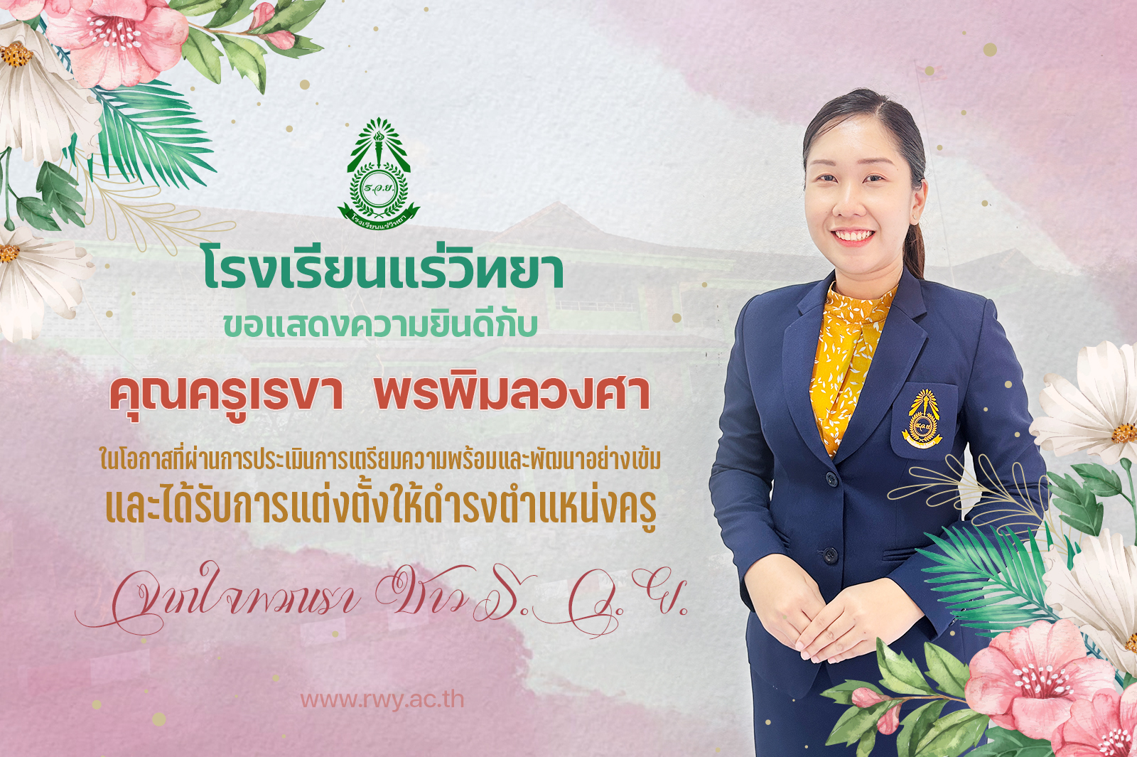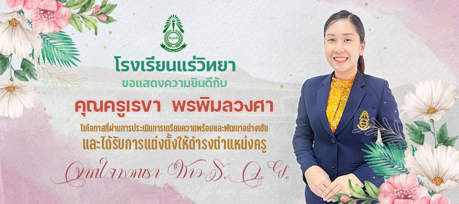 โรงเรียนแร่วิทยา ขอแสดงความยินดีกับ คุณครูเรขา  พรพิมลวงศา ในโอกาสที่ผ่านการประเมินการเตรียมความพร้อมและพัฒนาอย่างเข้ม และได้รับการแต่งตั้งให้ดำรงตำแหน่งครู
