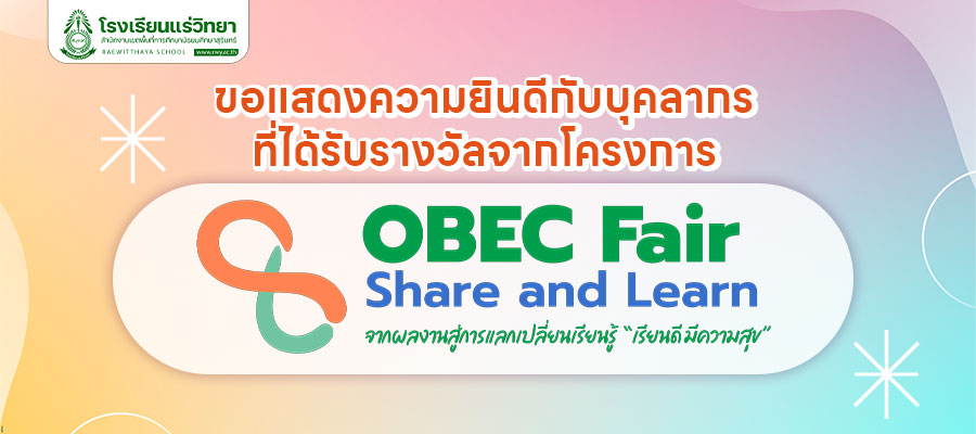 โรงเรียนแร่วิทยา นำโดยผู้อำนวยการวิรัติ พนารัตน์ ร่วมแสดงความยินดีกับบุคลากร ที่ได้รับรางวัลการการเข้าร่วมโครงการ OBEC Fair Share and Learn จากผลงานสู่การแลกเปลี่ยนเรียนรู้ “เรียนดี มีความสุข” ดังนี้