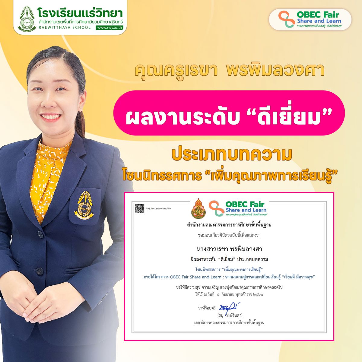 1. คุณครูเรขา พรพิมลวงศา มีผลงานระดับดีเยี่ยม ประเภทบทความ โซนนิทรรศการ "เพิ่มคุณภาพการเรียนรู้"