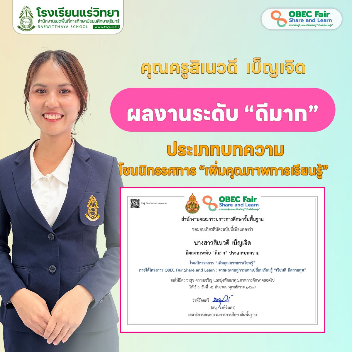 2. คุณครูสิเนวดี เบ็ญเจิด มีผลงานระดับดีมาก ประเภทบทความ โซนนิทรรศการ "เพิ่มคุณภาพการเรียนรู้"