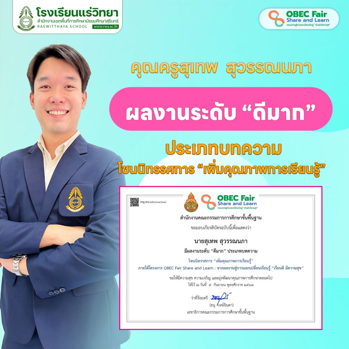 3. คุณครูสุเทพ สุวรรณนภา มีผลงานระดับดีมาก ประเภทบทความ โซนนิทรรศการ "เพิ่มคุณภาพการเรียนรู้"