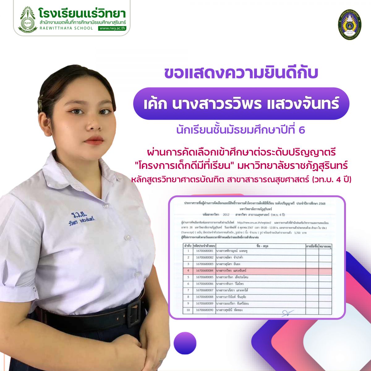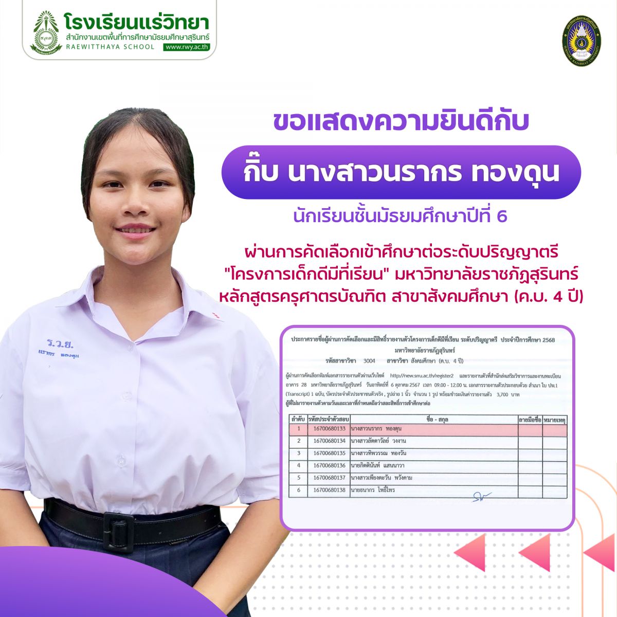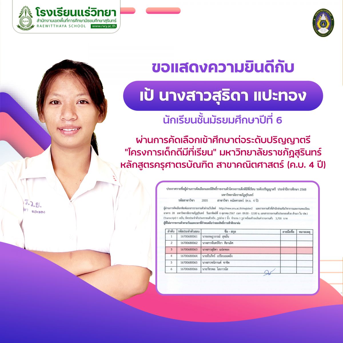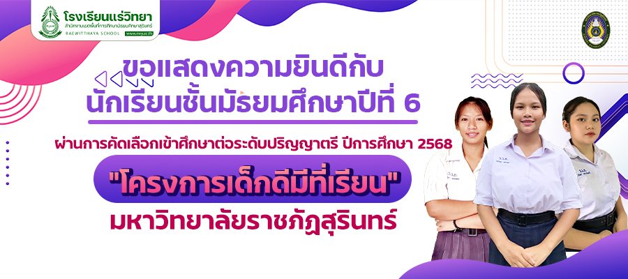 โรงเรียนแร่วิทยา ขอ แสดงความยินดี กับนักเรียนชั้นมัธยมศึกษาปีที่ 6 ผ่านการคัดเลือกเข้าศึกษาต่อระดับปริญญาตรี ปีการศึกษา 2568 โครงการเด็กดีมีที่เรียน มหาวิทยาลัยราชภัฏสุรินทร์