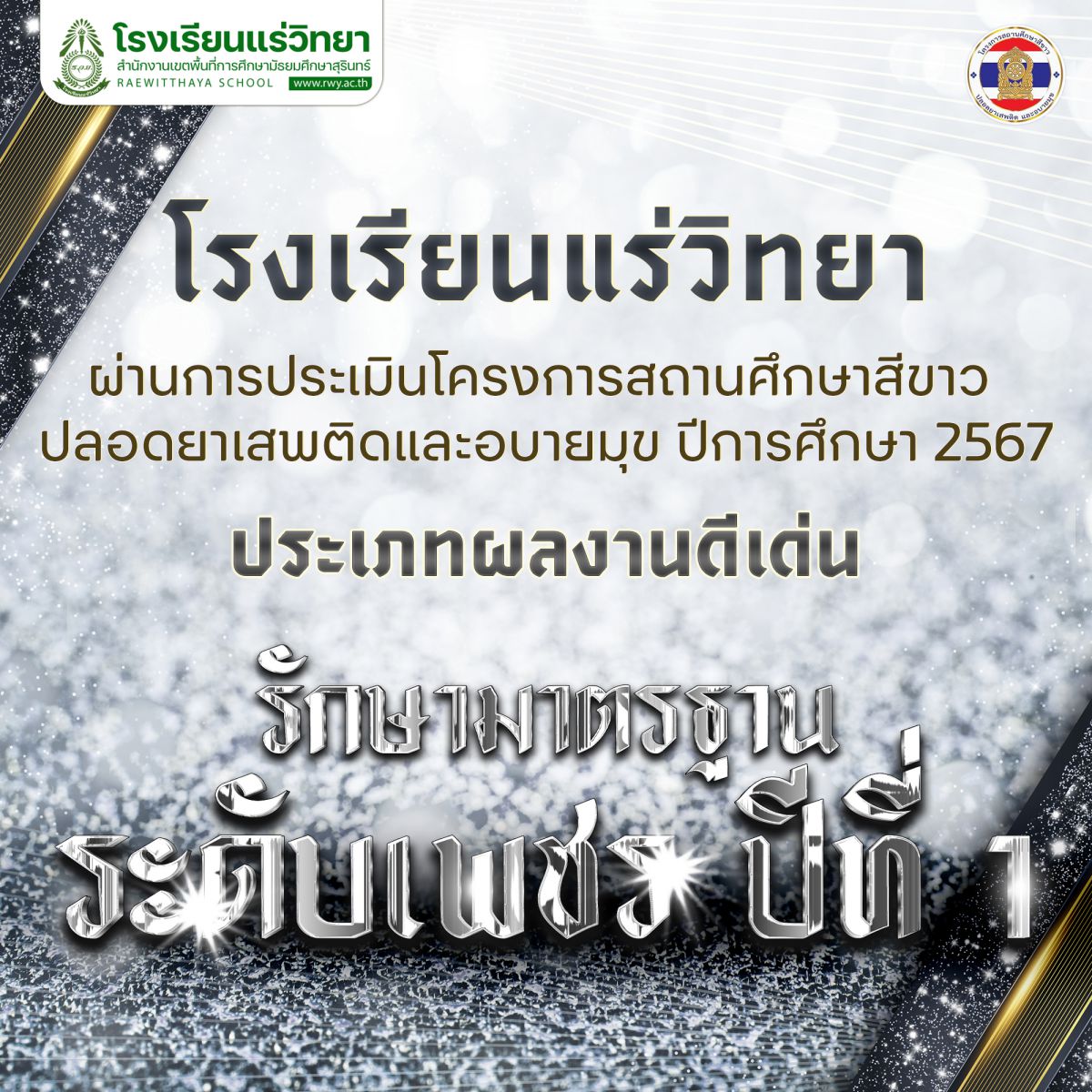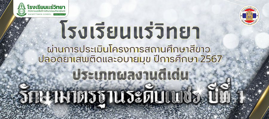 โรงเรียนแร่วิทยา สำนักงานเขตพื้นที่การศึกษามัธยมศึกษาสุรินทร์ ผ่านการประเมินโครงการสถานศึกษาสีขาว ปลอดยาเสพติดและอบายมุข ปีการศึกษา 2567 ประเภทผลงานดีเด่น รักษามาตรฐานระดับเพชร ปีที่ 1