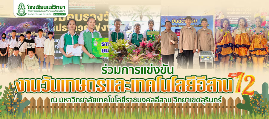 วันที่ 22-25 กุมภาพันธ์ 2568 โรงเรียนแร่วิทยา นำโดย นายวิรัติ  พนารัตน์ ผู้อำนวยการโรงเรียน นำนักเรียนเข้าร่วมการแข่งขัน เนื่องในงานวันเกษตรและเทคโนโลยีอีสาน ครั้งที่ 12 ณ มหาวิทยาลัยเทคโนโลยีราชมงคลอีสาน วิทยาเขตสุรินทร์ การแข่งขันราชมงคลสุรินทร์ E-SPORT การแข่งขันจัดตู้พรรณไม้น้ำสวยงาม ครั้งที่ 6 ได้รับรางวัลชมเชย การแข่งขันจัดสวนประดับสร้างสรรค์ ได้รับรางวัลชมเชย การแข่งขันหุ่นยนต์ราชมงคลสุรินทร์ ประจำปี 2568  และการแข่งขันส้มตำลีลา