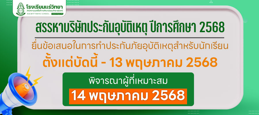 จึงขอเชิญชวนผู้รับประกันภัยที่จดทะเบียนกับส านักงานคณะกรรมการการกำกับและส่งเสริมการประกอบธุรกิจประกันภัย (คปภ.) ที่ประสงค์จะรับประกันภัยอุบัติเหตุนักเรียน ปีการศึกษา 2568 ขอให้ยื่นข้อเสนอในการทำประกันภัยอุบัติเหตุสำหรับนักเรียนโรงเรียนแร่วิทยาได้ที่ห้องประชุมโรงเรียนแร่วิทยา อาคาร 1 ชั้น 2 ภายในวันที่ 13 พฤษภาคม พ.ศ. 2568 ระหว่างเวลา 9.00 น ถึง 16.00 น. และคณะกรรมการจะพิจารณาผู้ที่เหมาะสมในวันที่ 14 พฤษภาคม พ.ศ. 2568
