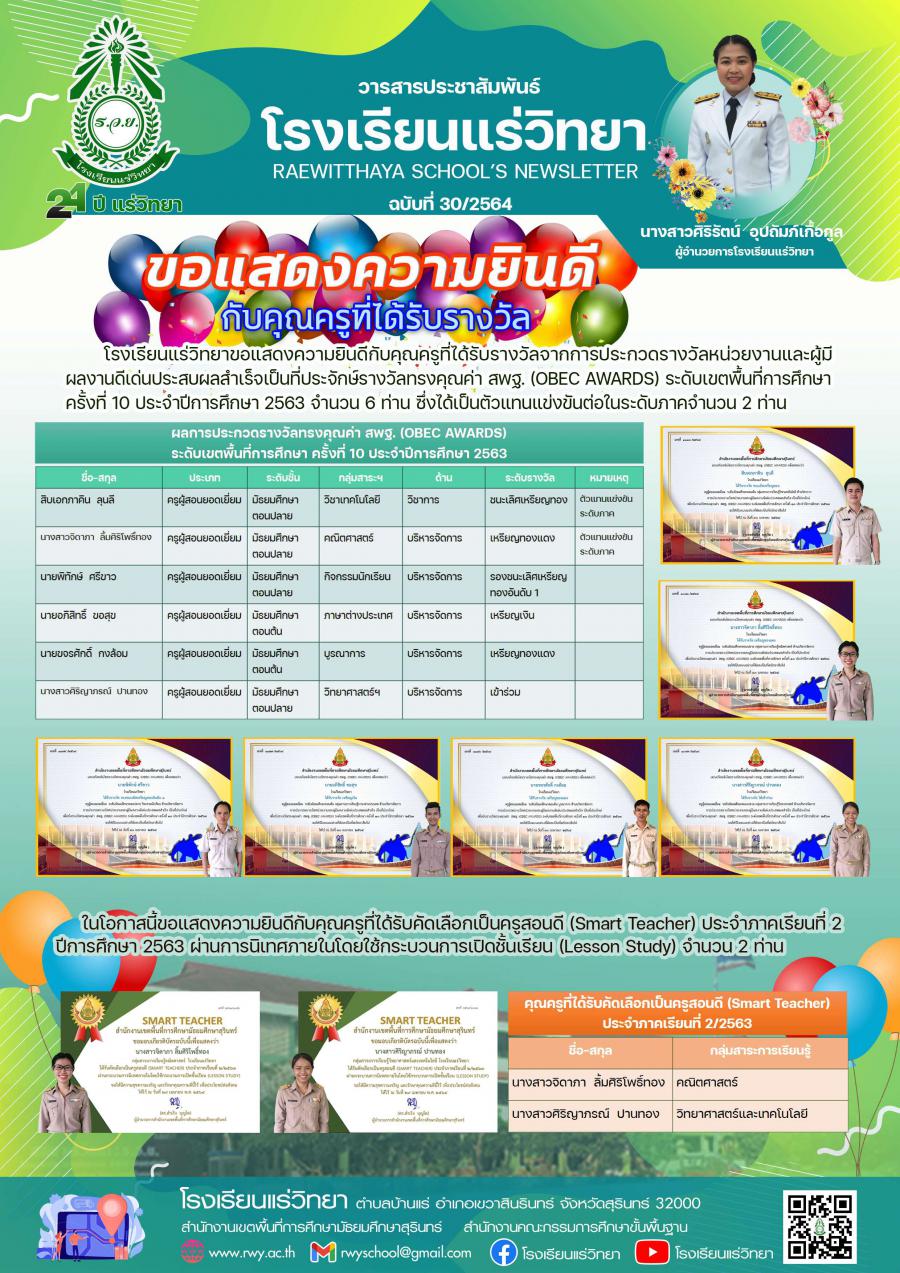 ในโอกาสนี้ขอแสดงความยินดีกับคุณครูที่ได้รับคัดเลือกเป็นครูสอนดี (Smart Teacher) ประจำภาคเรียนที่ 2